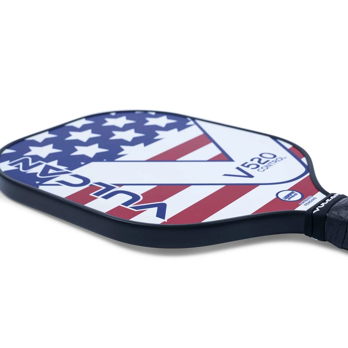 The Vulcan 520 Middleweight Composite Pickleball Paddle is made for control! Vulcan 520 Middleweight Composite Pickleball Paddle is designed for touch and placement players who play a high-percentage tactical game, or games near the kitchen. Emphasis on control and a softer feel for the touch you will need at the net. The Vulcan 520 Middleweight Composite Pickleball Paddle will feature the Vulcan Modern Shape, with a standard 13mm polypropylene core with Fiberglass V-Skin surface. Vulcan Max Control Grip at 4-1/4โ. Theย Vulcan 520 Middleweight Composite Pickleball Paddle is made toย 7.8 oz. Standard Weight. Available in “Dead Red,” “Fiji,” and “Fire & Ice” colors, as well as the “Americana” design. Don’t forget, we offer free shipping on all pickleball paddles!